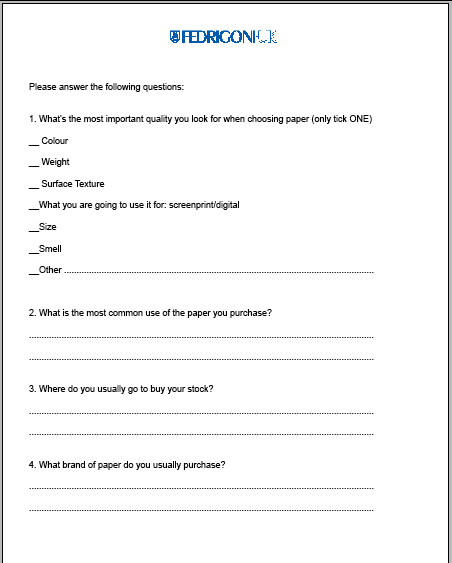 In order to get a better idea of what a graphic designer look for in their paper, we composed the following questionnaire printed it out and gave it to students within the class. The answers we receive should give us a better understanding of what we need to showcase within out notebook designs in order for them to appeal graphic designers and for them to then want to purchase Fedrigoni's papers for their next project.